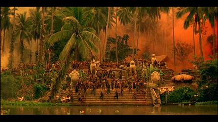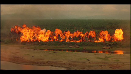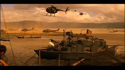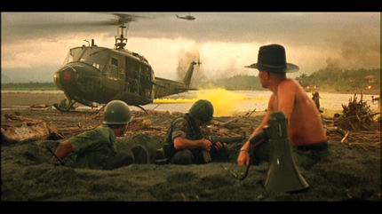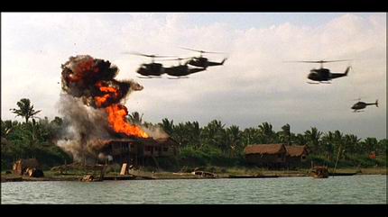 Coppola estaba obsesionado con la escena inicial del film: «Una imagen sencilla de árboles en la pantalla, cocoteros que se ven a través del velo del tiempo o un sueño. De vez en cuando, se elevan por el fotograma bocanadas de humo de colores. Oímos música sugerente de 1968 o 1969, tal vez los Moody Blues o «The End», de The Doors. Entonces, los trenes de aterrizaje de los helicópteros se mueven por todo el fotograma, pero sin que podamos distinguirlos del todo, más bien unos bultos sólidos que se mueven por el fotograma. De repente, sin previo aviso, los árboles estallan en una llama de napalm color rojo anaranjado y empezamos los créditos principales, la vista se desplaza de izquierda a derecha por los árboles en llamas, al tiempo que se mueven los helicópteros fantasma».Walter Murch recuerda al respecto que «poner una canción titulada The End al principio tiene su ironía y a pesar de todo, hay imágenes del principio que anuncian el final, así que, en cierto modo, es telegráfico. Este es el único elemento recurrente (utilizar a The Doors) que investigamos a conciencia en muchos montajes de la película, pero llegó a ser algo tan previsible, por pura curiosidad, que decidimos no exagerar el recurso.