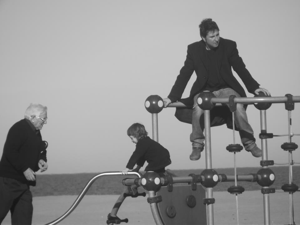 En esa fotografía se pierde mi mirada y no encuentra ninguna dirección sólida. La de mi pequeño es segura sobre la barra metálica. Mi padre nos vigila a ambos, aguardando sujetarnos con su vejez a cuestas, con sus piernas doloridas y sus ojos azules tan tristes. No hemos olvidado nada o eso espero. Los siglos de la familia flotan en ese cielo, en esas líneas rectas que conforman el cielo, el mar y la arena de la playa. Mateo tal vez busque un navegar más plácido que mis vuelos con caída. Estoy a punto de caerme ante tantos nombre muertos, tantas palabras sin sentido, tantas vidas desaparecidas entre mis dedos, tanta incertidumbre ante el futuro.