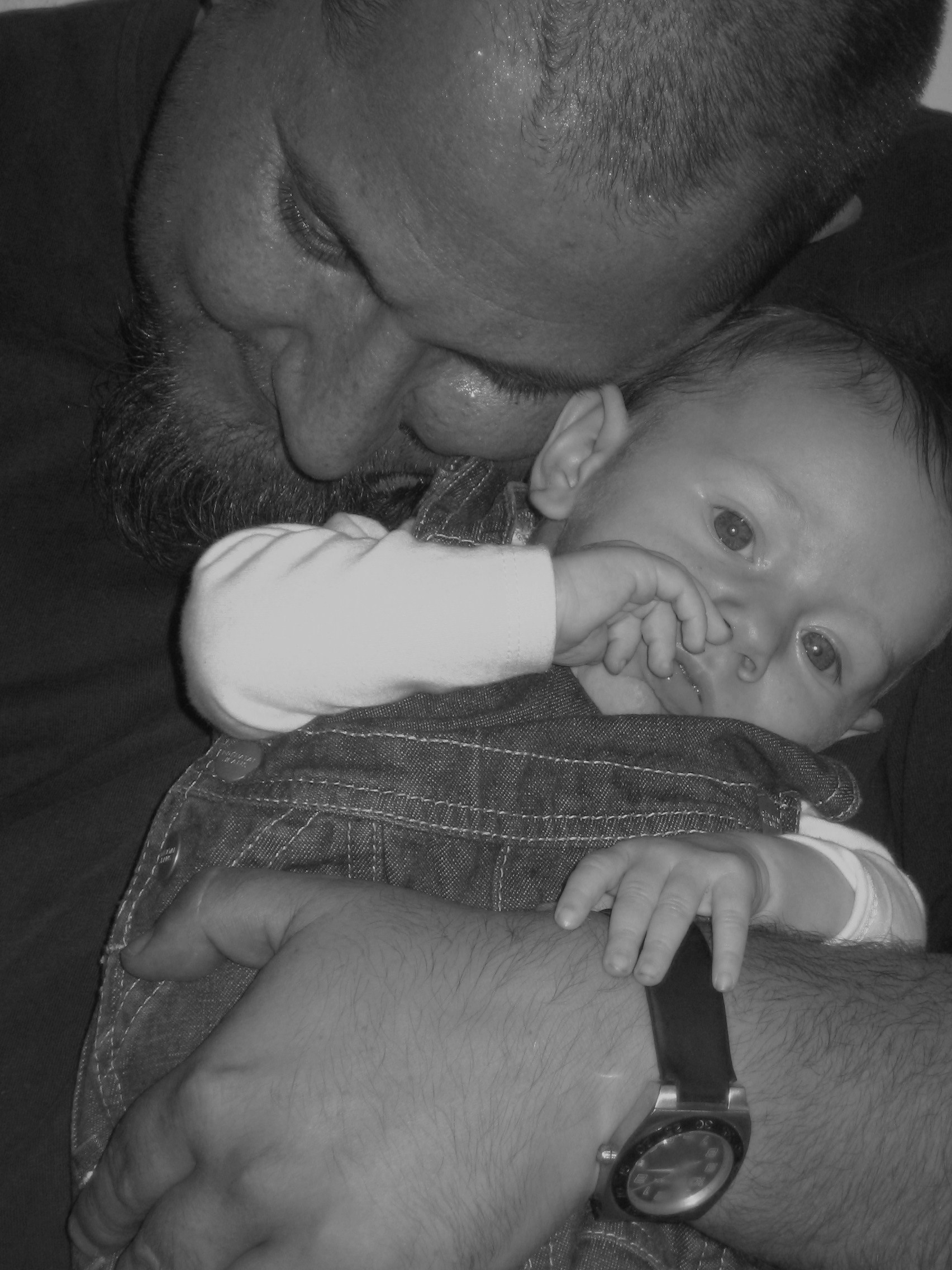 La fotografía, sin saber la razón, se la envié al día siguiente de recibirla a mi amiga Diana de Concordia. Ella expresó con una precisión extraordinaria lo que le sugería la imagen. De alguna forma me dio claves que, con el peso sentimental de la misma, había obviado. Pienso que es una buena fotografía, y aunque esa sensación pueda deberse al componente afectivo que me ata a su significado, me quedo con la belleza de su mirada. La guardaré toda la vida. Nos retrató en un momento hermoso; un viernes por la mañana de asueto, con la fatiga de la semana en mi rostro, la tensión ante un futuro oscuro; la alegría del pequeño por tener a su papá y a su abuelo en un día inusitado, y por no ir a la guardería; el lógico entusiasmo de mi viejo por el matrimonio civil de mi hermana pequeña, que está en la foto sin que aparezca, contemplando ese instante.