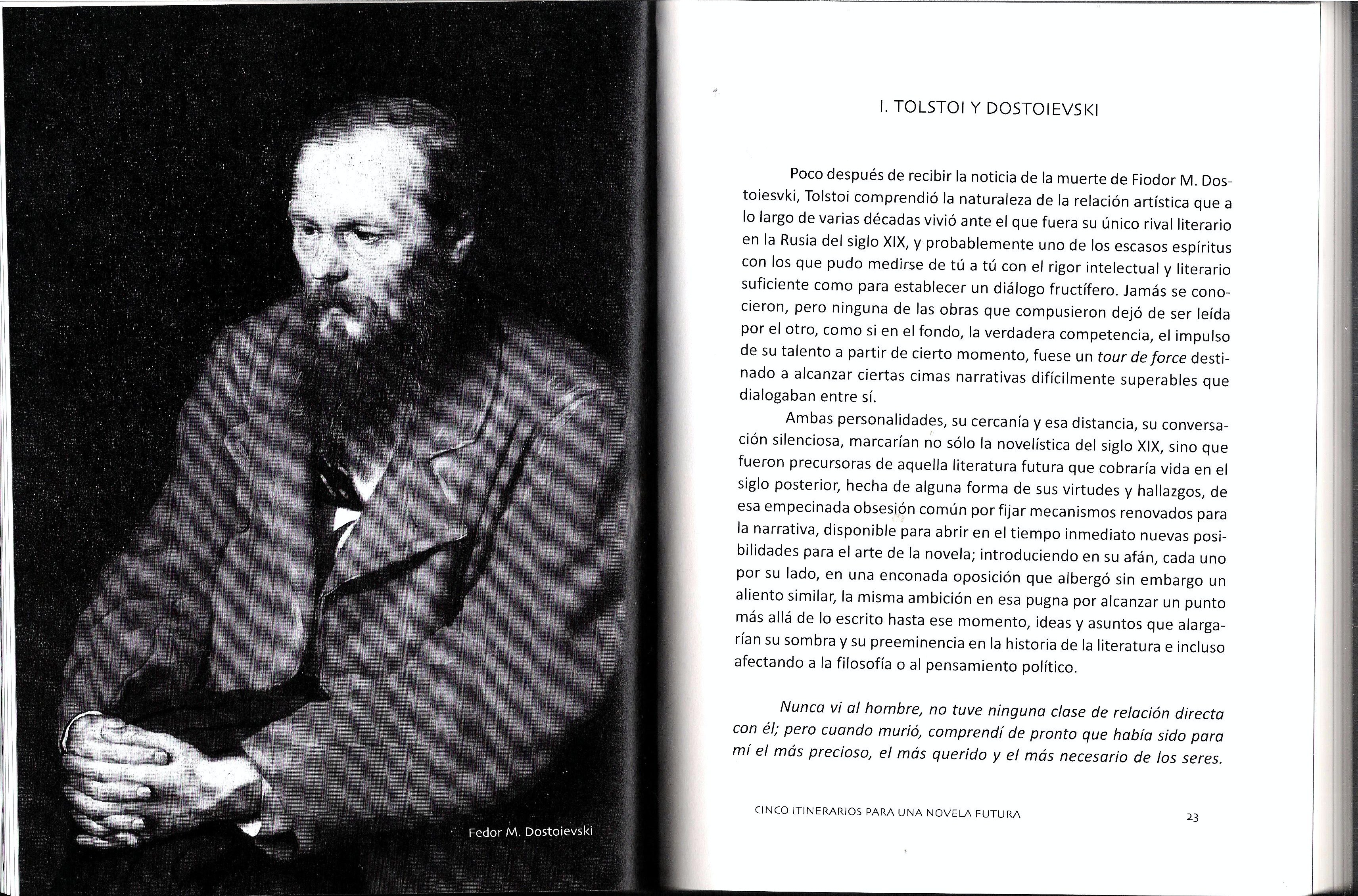 Cuando en el transcurso de las navidades del año 2010 y los inicios del 2011 Los milagros de Dostoievski puso a prueba mis nervios, no sólo por la lectura febril de Fiodor, sino por la dificultad de afrontar con dignidad a un autor de semejante envergadura, por ese acompañamiento tolstiano que me vi obligado a cumplir para hallar un espejo donde comparar su valor o sus ideas con garantías, esa especie de supervisión desde la literatura del otro, comprendí que esos cinco itinerarios escritos; Instrucciones para la literatura salvaje, Roberto Bolaño; Richard Ford y la literatura norteamericana, de la mano de Richard Ford; La montaña mágica: una novela de Europa, con Thomas Mann y El Tiempo literario y la memoria, a través de En busca del tiempo perdido de Proust, no habían sido otra cosa que un ejercicio de lectura convertido en escritura destinado a buscar lineas de fuga hacia el presente, un intento de actualizar aquello que me fue tan útil en las primeras décadas de mi vida, un ajuste de cuentas con un tiempo y una existencia que se me antojaba perdida, naufragada en un mar agitado de voracidad y confusión. En definitiva, se trató de rastrear un horizonte de la literatura futura desde el pasado, buscar los elementos que debía guardar en su seno la novela para seguir ofreciendo esa verdad deliciosa y placentera, de una belleza estética deslumbrante, ese lugar de sabiduría que durante siglos había acompañado a la humanidad como un acto de inteligencia y civilización.