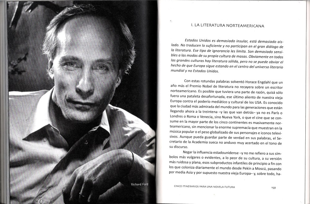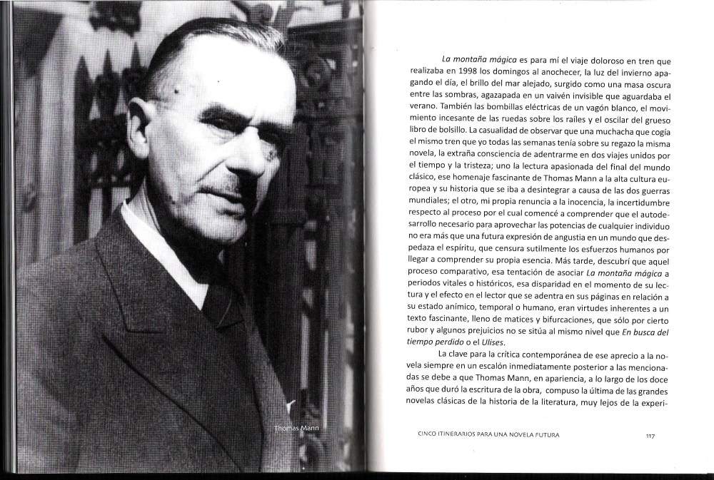Podrá reprocharse a Cinco itinerarios para una novela futura -y eso es algo que asumí desde el primer momento en que escribí en marzo del 2011 el prólogo, al comprender la unidad del recorrido- cierta subjetividad, o una insistencia en el gusto, pero al afirmar el motivo del libro en esa breve introducción, la que inicia la obra, creí ser capaz de sostener con argumentos, con cierta lógica, la pasión con la que había leído y releído las novelas de cada uno de esos cinco autores que conforman el texto, y sobre todo sus ramificaciones constantes e inevitables hacia mi presente y el futuro de la literatura y el mundo. Había hallado la cartografía en la que se sostenía todo ese periodo, parte de mi juventud, hasta esa temida madurez que, al final, no era para tanto. Y en esos itinerarios se hallaba además toda la esperanza y la fe en la supervivencia de la novela, en todo aquello que seguimos considerando ineludible y delicioso de este arte antiguo.