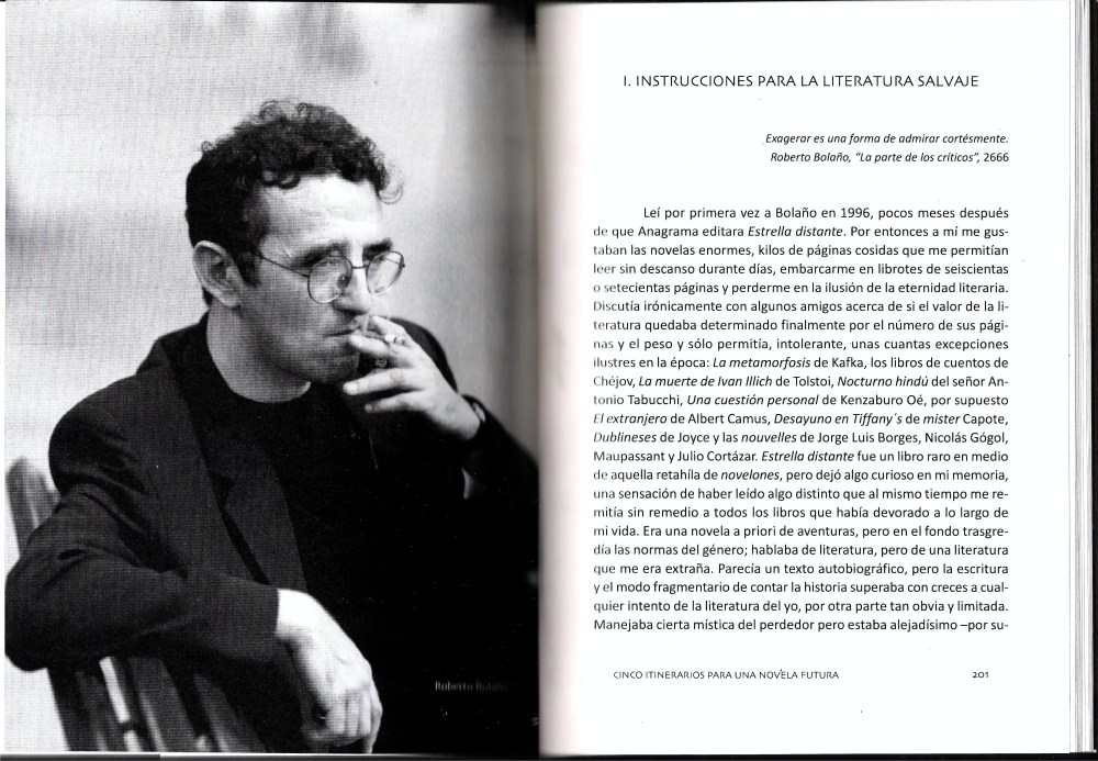 Hace dos años, tal vez algo más de lo que pienso, de modo inconsciente, nacieron estos Cinco itinerarios para una novela futura. Primero con Bolaño, por supuesto, en un texto muy lejano en la memoria, lleno de aquel regreso a la literatura que desde 1995 había abandonado, cumpliendo a conciencia ese aire de Bartleby enfebrecido, hastiado y melancólico, tal vez perplejo ante la vida nueva. Quizás fuese Bolaño y aquel texto, Instrucciones para la literatura salvaje, lo que me concedió otro lugar, otro ánimo. Él y su poema sobre Perec a su vez. Yo había paseado como Roberto de la mano de esos niños de letras día tras día sin saber qué hacer, y entonces leí ese breve poema: Un paseo por la literatura, y me hizo escribir, de otra forma, alejarme de ciertas obsesiones que debían desaparecer, encontrar la senda que justificase la razón por la que seguía creyendo en el futuro de la novela y en la historia de la literatura. Esa breve introducción al mundo de Bolaño se hizo algo más amplia, y aún así, me parece el texto más cercano y sencillo, más que el resto, aunque sea el último paso del itinerario, tal vez el más difícil de comprender y expresar.
